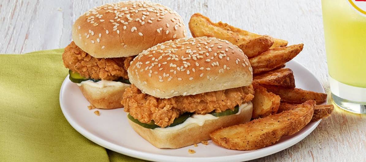 KFC Chicken Littles are bite-sized sandwiches that feature the chain’s golden crispy, breaded chicken tenders, pickles and the Colonel’s mayo on a mini hot dog shaped bun with sesame seeds. Chicken Littles may be small in size, but they’re big in flavor. The bun is sweet, but it complements the 100 percent all-white breast meat chicken perfectly. And since you get two mini crispy chicken sandwiches when you order this item, you can always save one for later.