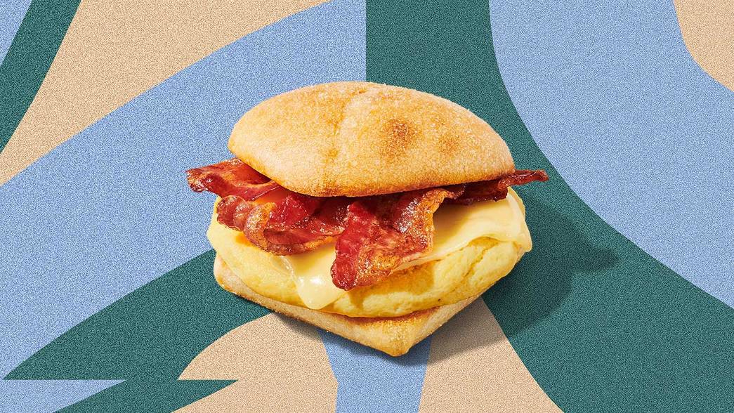 The Bacon, Gouda & Egg Sandwich features a Parmesan cage-free egg frittata topped with melted aged Gouda and applewood-smoked bacon on an artisan roll.